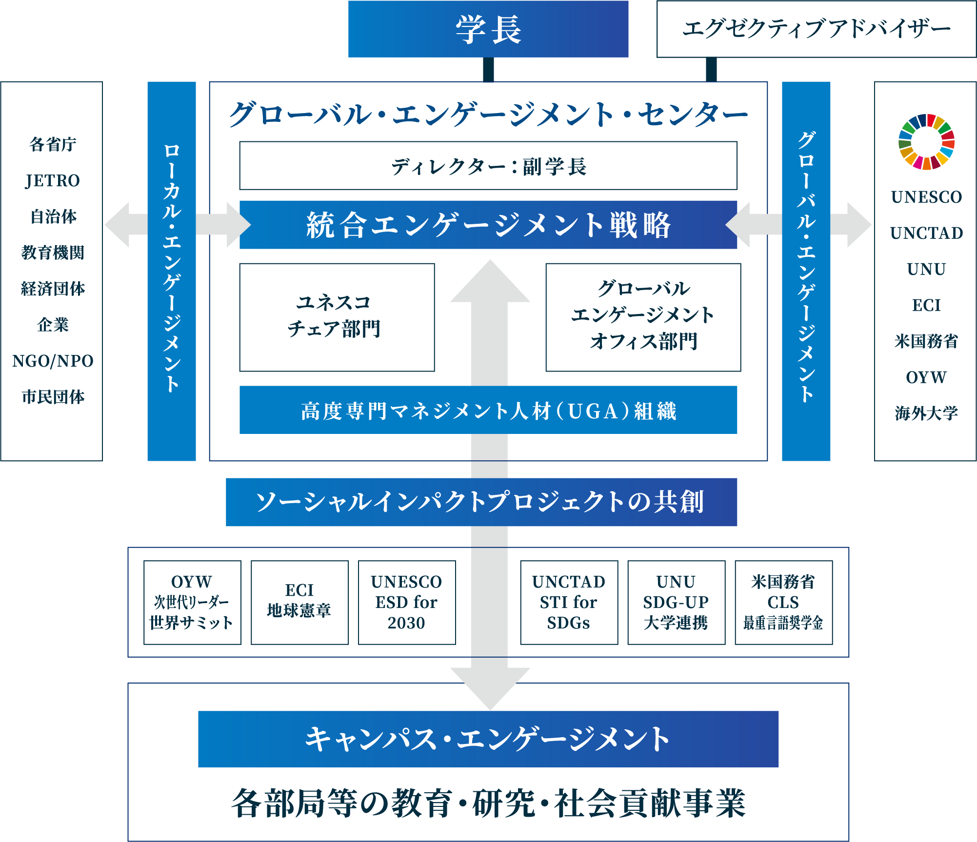 グローバル・エンゲージメントを加速し、大学の組織的な教育研究を推進及び国際的な連携及び協働の促進並びにネットワークの強化を図ることで、SDGs推進研究大学としての研究力を高め、経営基盤の安定化及び国際的なプレゼンスの向上にも寄与します。