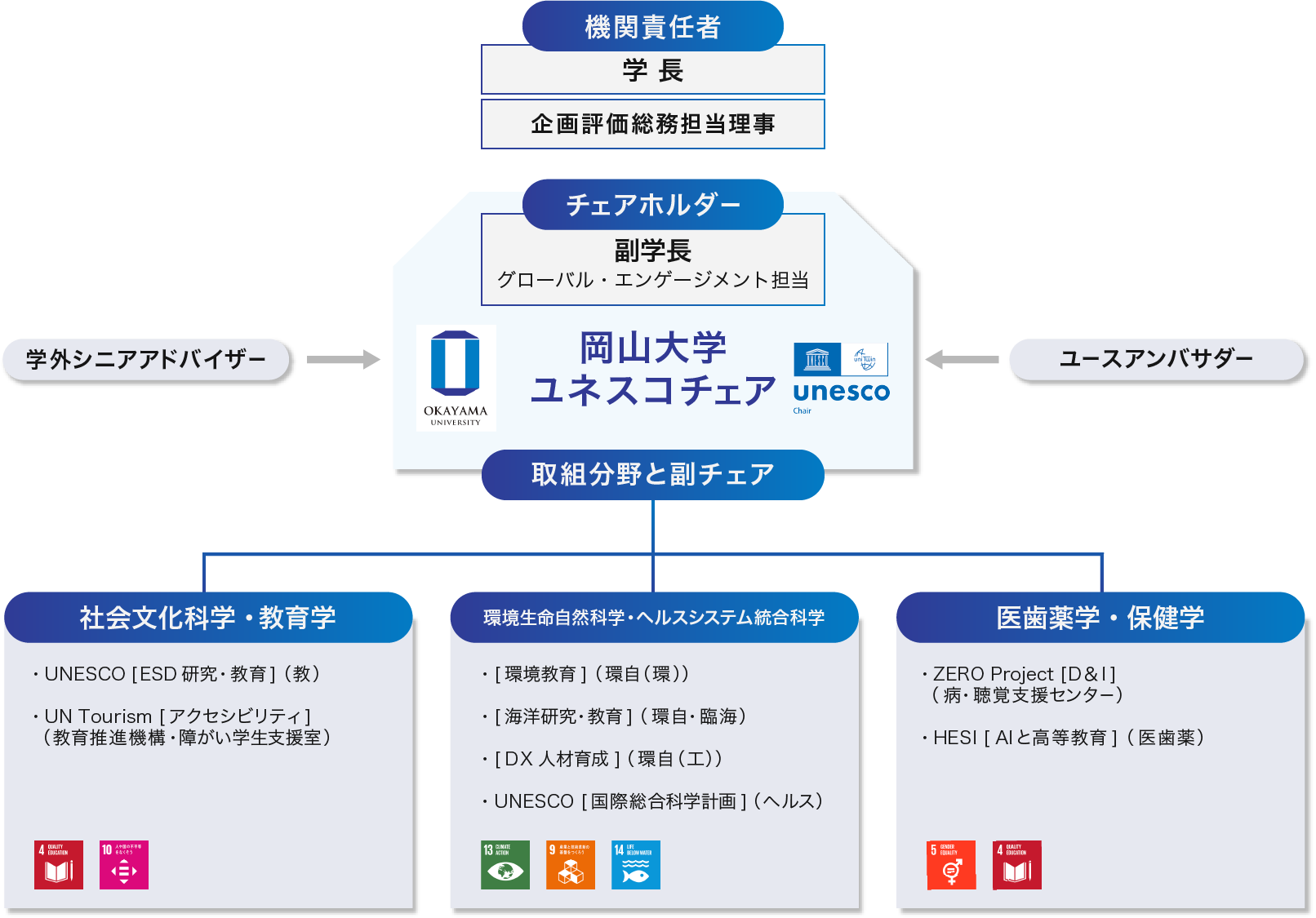 岡山大学ユネスコチェアは、地域に根ざした実践と国際的ネットワークを結ぶハブとして機能し続け、2024年には、世界120ヵ国950のユネスコチェアを設置している大学・機関の中から「世界を代表する20のユネスコチェア」として日本で唯一選出されました。その会合でSDGsを軸とした全学的な教育・研究・社会連携の枠組みを紹介し、若者の声を反映する世界初の「ユネスコチェアユースアンバサダー制度」や、 UNCTAD(国連貿易開発会議)との連携による「若手女性科学者プログラム」など、次世代を中心としたジェンダー平等・若者参画の仕組みは特に高く評価されました。